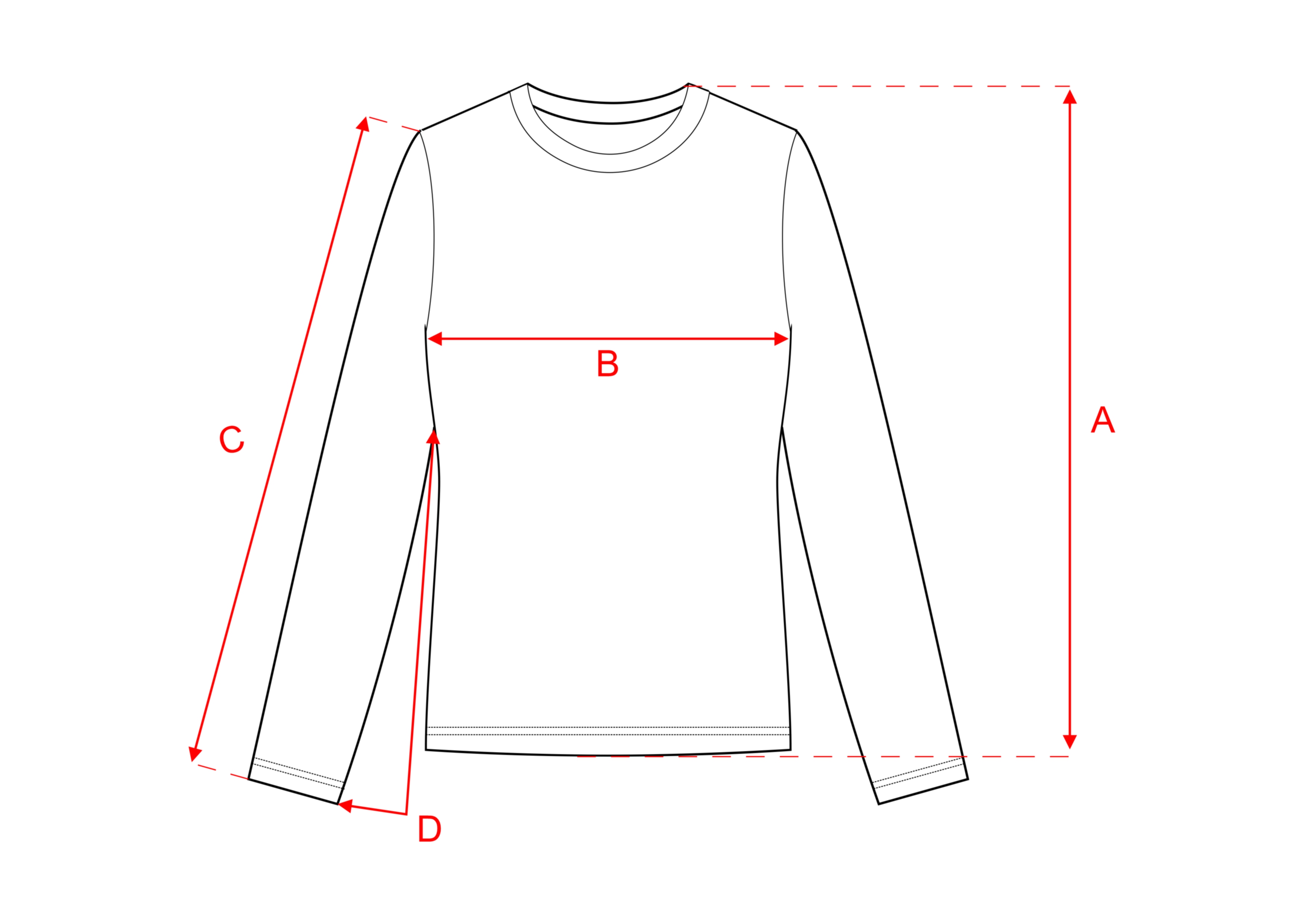 [MÉRET]. [A] Teljes hosszúság [B] Mellkas kerülete (az anyag 66 cm-ig nyúlik) [C] Külső ujj hosszú [D] Belső ujjhossz